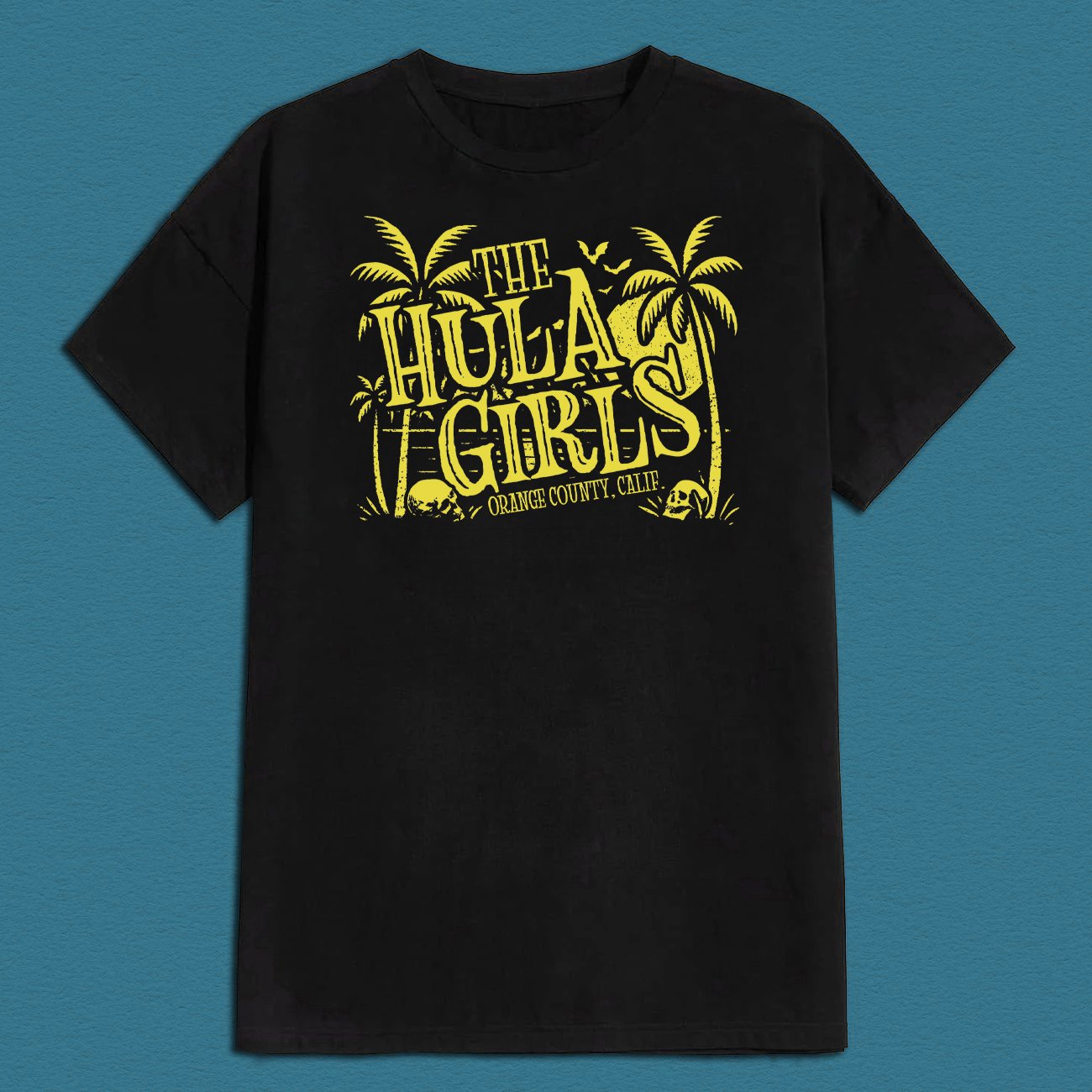 It's sundown on Jungle Beach. Large chest logo The Hula Girls Jungle Beach Tee designed by Shorty and Spike